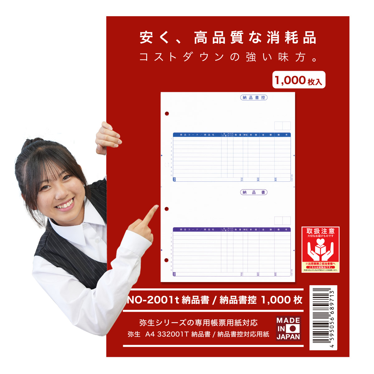 - 332001汎用納品伝票 1,000枚 品番:INO-2001 送料無料 代引き手数料無料 安心の日本製 オリジナル 伝票 業務用 弥生 やよい