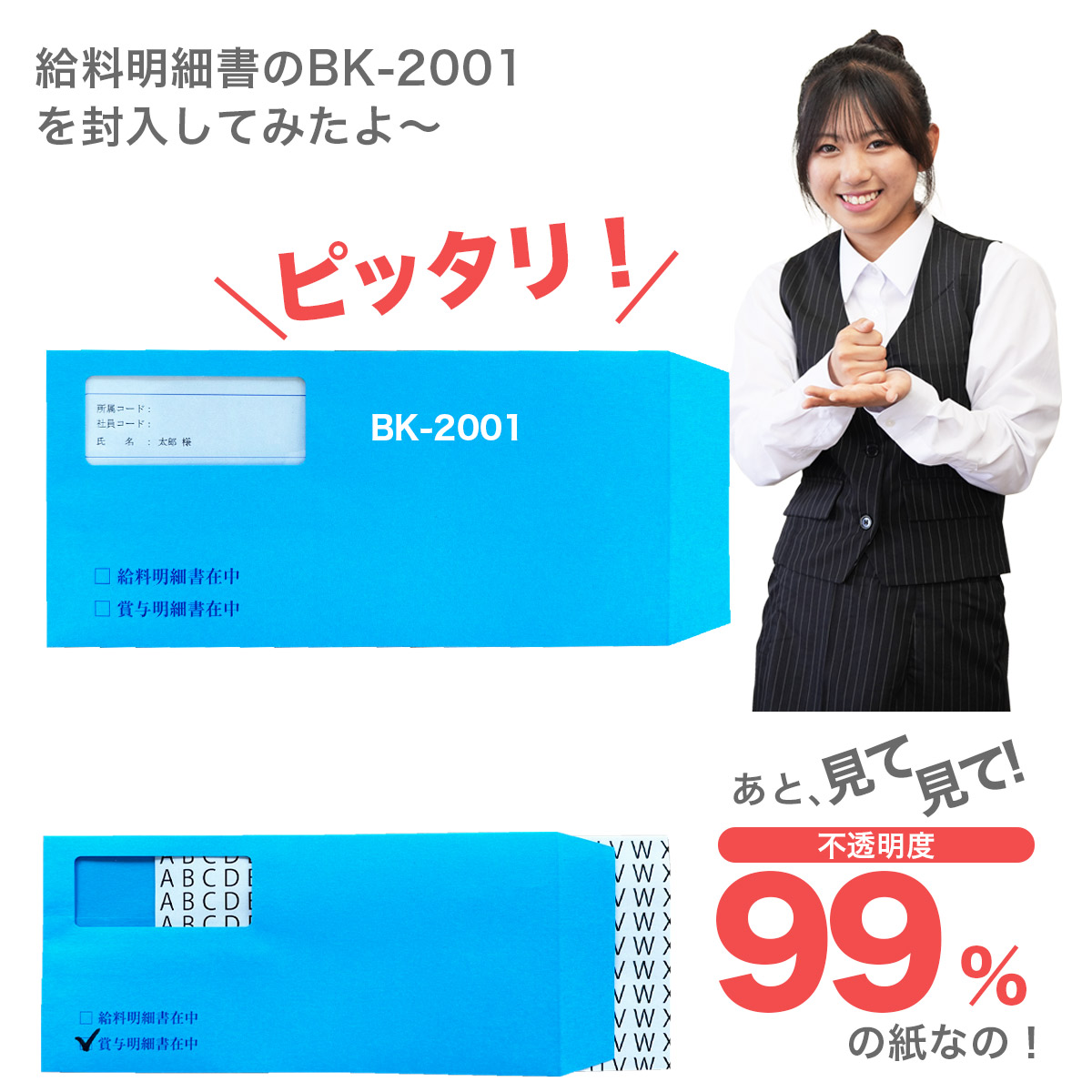 | 特 徴 | ・シールテープ付き ・透けない加工 ・給与、賞与がわかるチェックボックス付き |